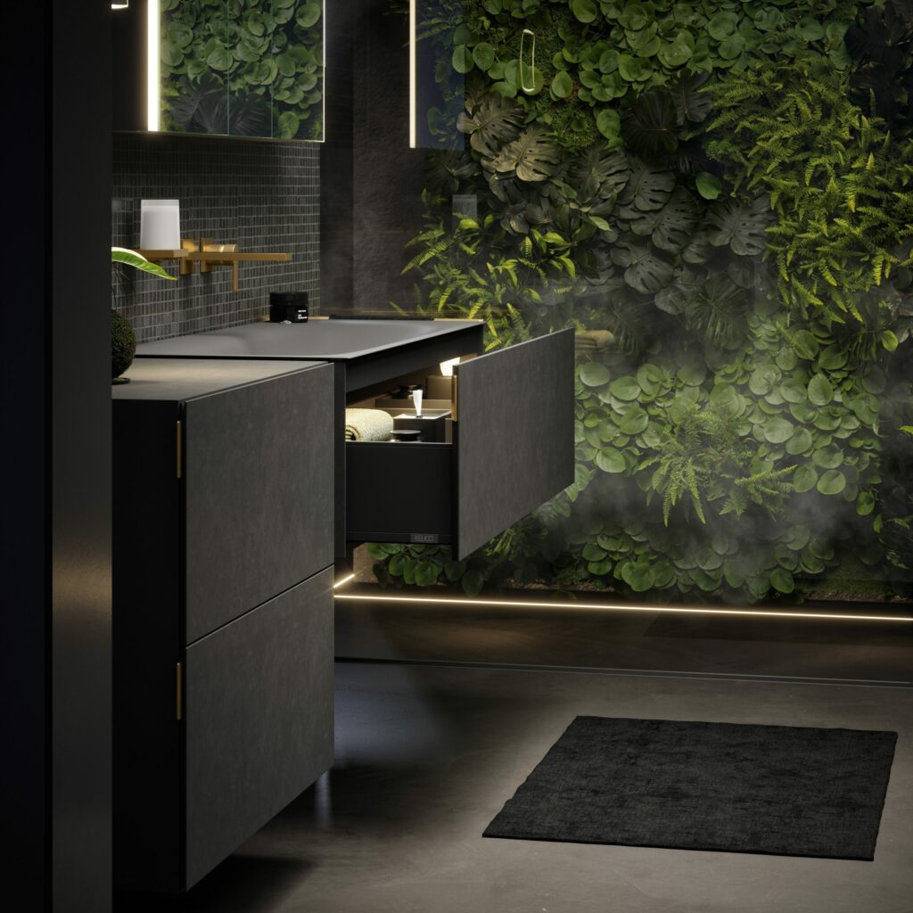 Als Einzel- oder Doppelwaschtischlösungen können so einzigartige Badwelten geschaffen werden. Für ausreichend Stauraum sorgen Breiten von 800 mm und 1200 mm, wahlweise mit ein oder zwei Schubladen. Die filigranen Kanten des Emaille-Waschtisches von extrem schlanken 4 mm verschmelzen optisch mit dem Waschtischunterbau und sorgen für eine monolithische Anmutung, bei der Möbel und Waschtisch wie aus einem Guss wirken. Neben dem samtigen, seidenmatten Lack sind die edlen Möbeloberflächen in verschiedenen hochwertigen Materialien wie Furnier, Keramik und Glas verfügbar – letztere beiden sind ebenfalls perfekt auf die Farben der Waschtische abgestimmt, um die Homogenität des Designs zu gewährleisten.